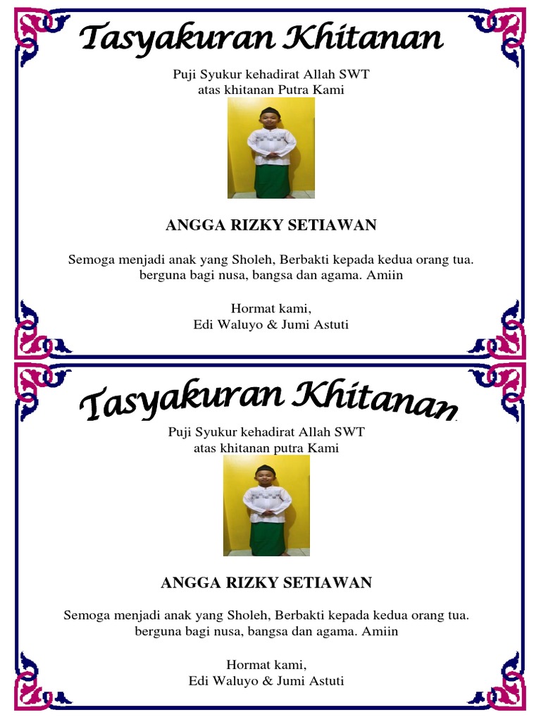27042019 kartu ucapan khitanan desain lucu ini berukuran kertas a5 21cm x 148cm atau setengah dari ukuran kertas a4. Contoh tulisan syukuran aqiqah agung id. Tedak siten turun tanah cetta. Contoh kartu ucapan aqiqah bayi pada berkat (kotak nasi) 2015. Biasanya kartu ucapan ini diletakkan di dalam kotak nasi, yang diberikan ada banyak sekali doa dan ucapan aqiqah yang bisa anda gunakan, beberapa contoh dan referensinya telah kami berikan.